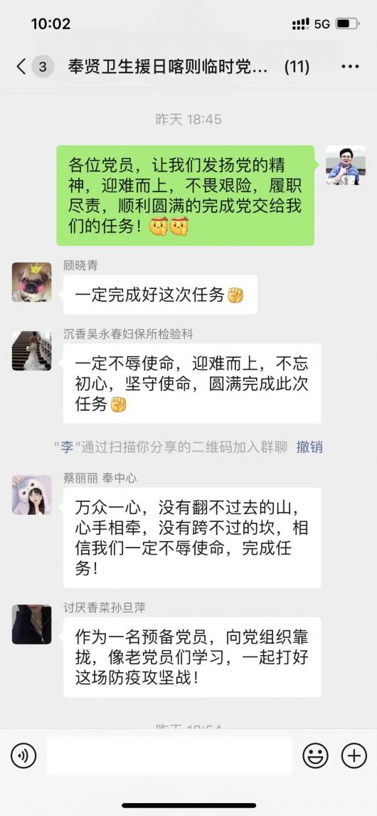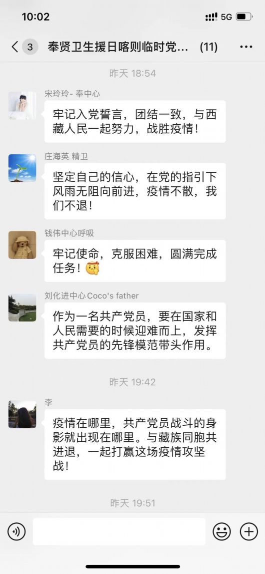 据了解,两批援藏队员,目前定点闭环管理在三个地方,平常的沟通主要通过工作微信。“奉贤卫生援日喀则”临时党支部就地成立。不能开展线下的集体组织生活,那就通过线上的形式。“牢记入党誓言,团结一致,与西藏人民一起努力,战胜疫情”“作为一名预备党员,向党组织靠拢,向老党员学习,一起打好这场防疫攻坚战。”特殊的线上组织生活方式凝聚了队员们的心,同时也坚定了大家必胜的信念。“我们这支队伍不仅代表着奉贤,也代表着上海的形象。一定会牢记使命,把工作做好。”张荣表示。