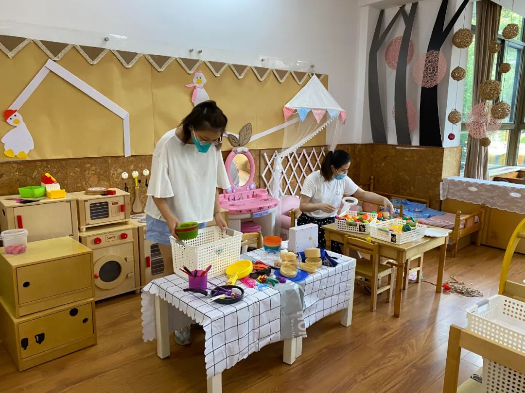 目前,幼儿园已经进行了全面环境清扫消毒,各个班级完成所有环境创设后,教室内幼儿玩教具以及幼儿桌椅、床、餐具等也会进行消毒。