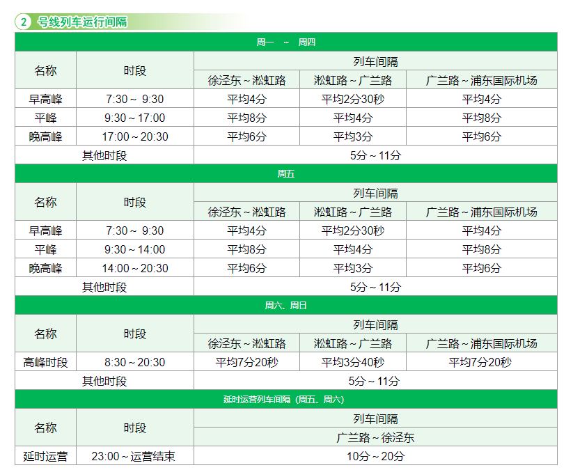 1. 2号线每周五、周六延长运营时间,不含2号线东延伸段(广兰路站~浦东国际机场站)。