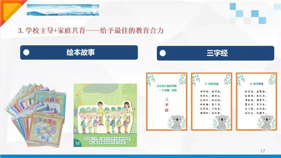 孩子的成长离不开学校的努力,同时也离不开家长的配合。沈老师也提出了9条对家长的建议:要信任——认同学校的办学理念,家校之间彼此信任,不随意诋毁学校或老师的名誉;要沟通——和学校、老师保持正向沟通,不急不躁、也不悲观,共力共为,在对孩子的教育上形成合力;要融洽——家长之间形成友好互助的融洽氛围,帮助孩子更好地从“小家”适应班级新集体,以及学校大家庭;要合作——家庭人员之间要分工合作,育儿观念和教养要求要一致,不过度溺爱、不放任不管;要接纳——接纳孩子的差异性,也要发掘孩子的潜能;要以身作则——引导孩子保持健康作息、健康饮食、健康习惯、健康情绪;要得体——家长个人行为要得体,还要引导孩子有规有矩;关注孩子的着装是否干净合适;要陪伴——有方法地陪伴孩子参加各类活动、给孩子鼓励支持和正确示范,让孩子有一定的自我练习和成长空间;要学习——了解孩子成长规律,合理地引导孩子去发展,积极参加学校举行的家长培训。