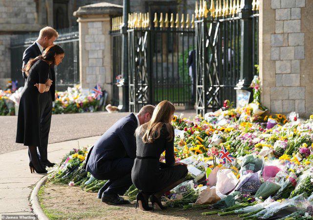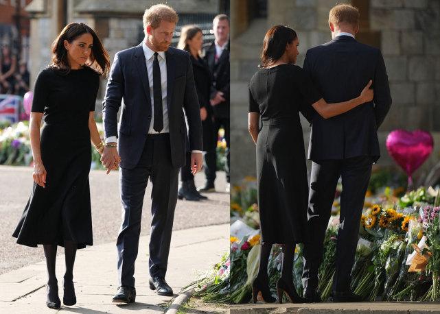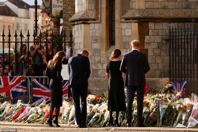 当地时间9月10日,新的威尔士王子威廉和威尔士王妃凯特,以及哈里王子和梅根·马克尔,一同出现在了温莎城堡的外面,向前来悼念女王的民众们表示感谢。