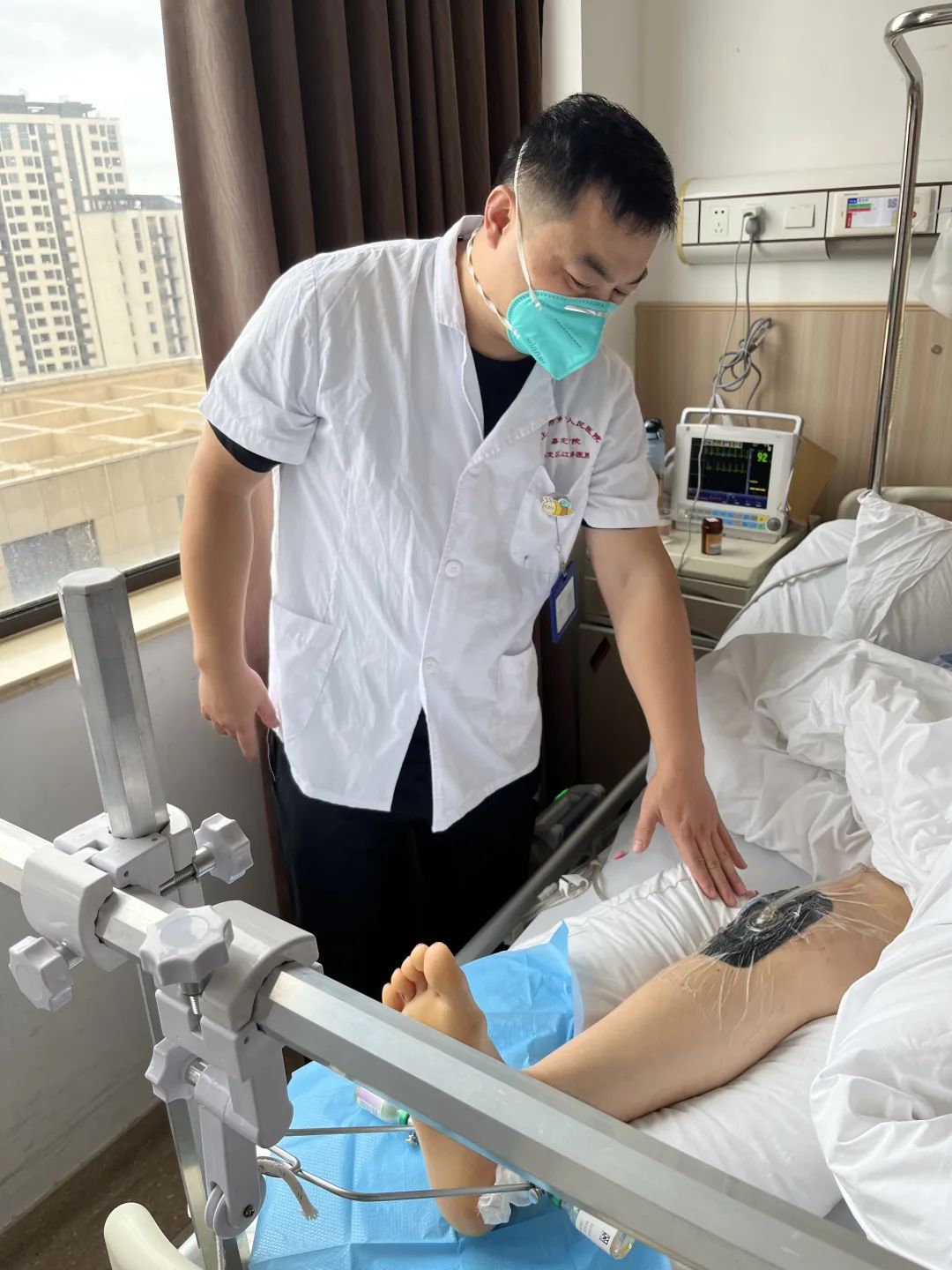 9月15日上午,在江桥医院住院部,医生在为刚做好手术的张女士复查。张女士告诉记者,9月14日上午她驾车时被后车追尾,导致身上3处骨折。“当时雨大风大,地上也很湿滑,后面的车没有及时刹车,就撞上了。”张女士说。