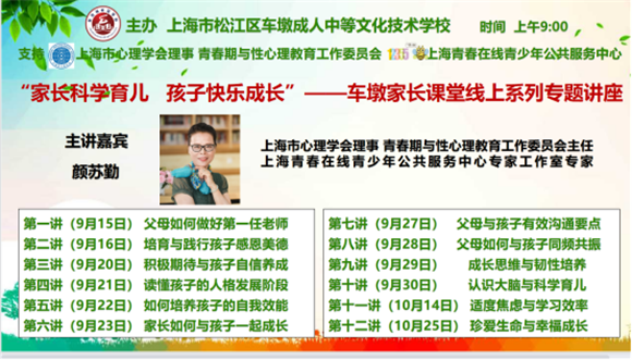 为深入贯彻《中华人民共和国家庭教育促进法》,进一步深化社区学校家庭教育工作,落实立德树人根本任务,推进家校共育、促进家校共赢,车墩成校依托品牌项目“车墩大讲堂”开展了以“家长科学育儿 孩子快乐成长”为主题的线上系列专题讲座,邀请了上海市心理学会青春期与性心理教育工作委员会主任、上海青春在线青少年公共服务中心专家工作室专家、上海师范大学教育学院心理系兼职研究生导师颜苏勤教授为主讲专家,共有20余人报名参加本次培训。