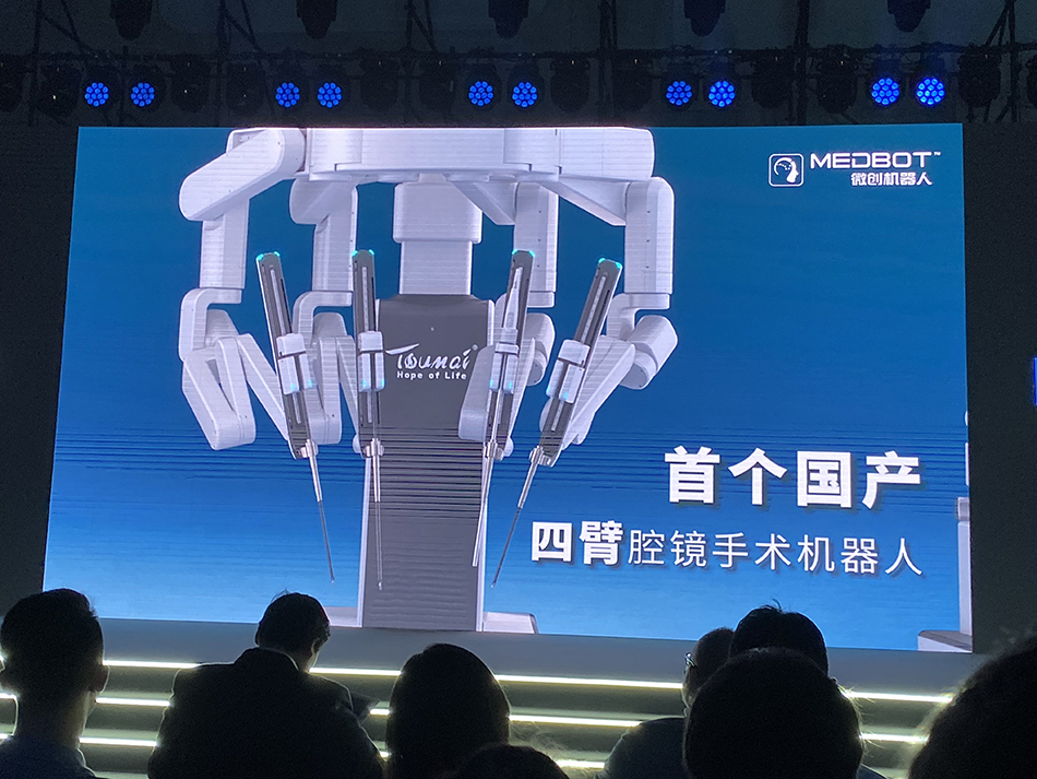 四款创新产品中的第一款手术机器人,是微创机器人自主研发的图迈腔镜手术机器人,它不仅是手术机器人领域研发难度最大的腔镜手术机器人,也是目前首款获NMPA批准上市的国产四臂腔镜手术机器人。