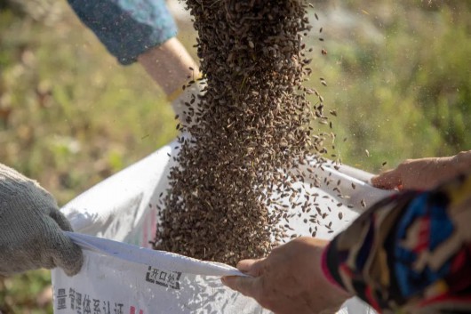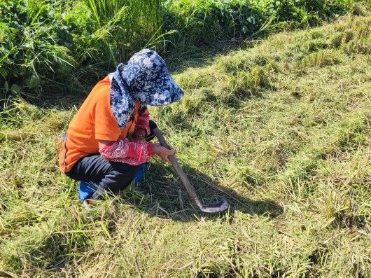 机械化收割后,三坎村的村民不落下一粒粮食,他们在稻田里仔细搜寻每一寸土地,不浪费一粒稻谷。