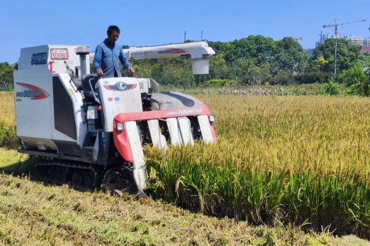 在三坎村的一片稻田里,金黄色的稻谷在阳光的衬托下更加炫目。一台台农用收割机正忙着作业,随着机器的靠近传来隆隆的轰鸣声。