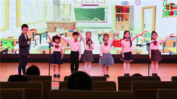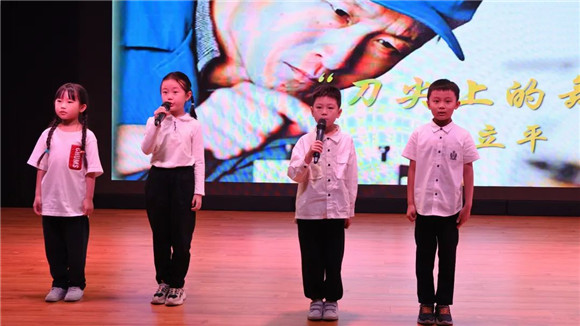 在校园剧场的舞台上,四年级队员用朗诵《我深深爱恋的祖国》,表达着爱国之心。