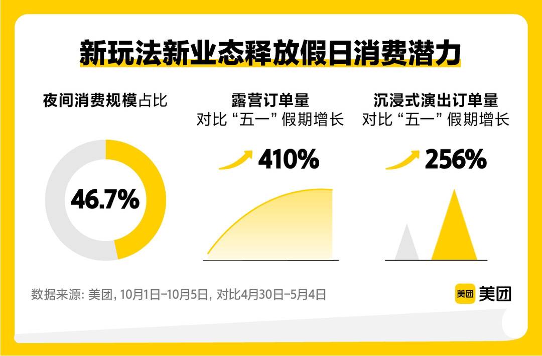 美团发布的2022年“十一”黄金周消费数据显示,今年国庆假期,本地消费占比77.4%,成为激发假日经济新动能的“主引擎”。长假期间本地业态的日均消费额相比“五一”假期增长34%,同比2019年黄金周增长52%。“即兴度假”催生新潮流,露营、亲子游、乡村游等新需求引领本地新供给,线上线下持续融合,订单量实现翻倍增长。