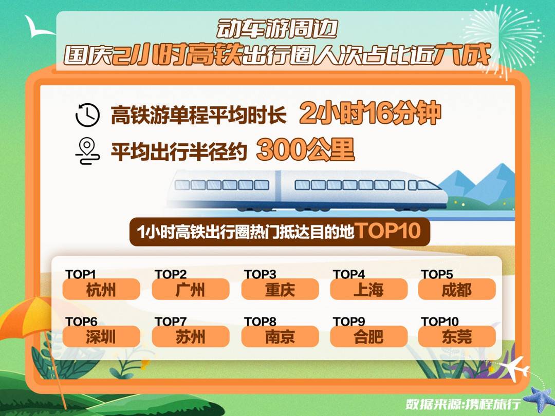 国庆2小时高铁圈的乘车人次占高铁乘车总人次的近六成,1小时高铁圈的乘车人次占比超三成。杭州、广州、重庆、上海、成都、深圳、苏州、南京、合肥、东莞成为国庆1小时高铁圈十大抵达热门城市。