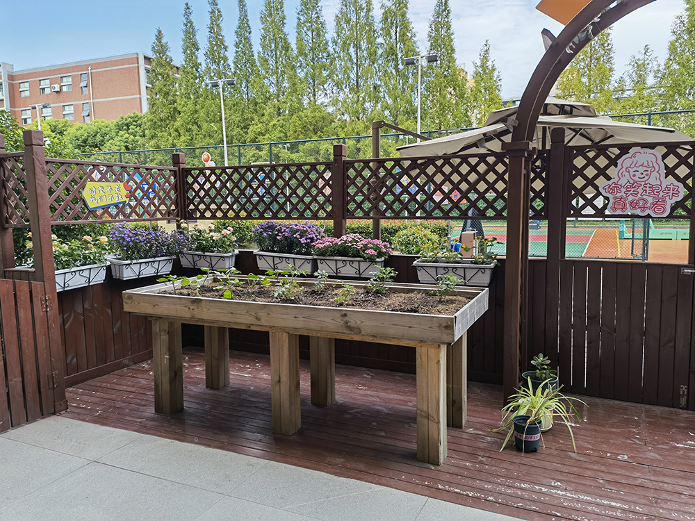 洋泾街道认知症日间照料中心外,老人可以在小花园种植物。澎湃新闻记者 陈少颖 图