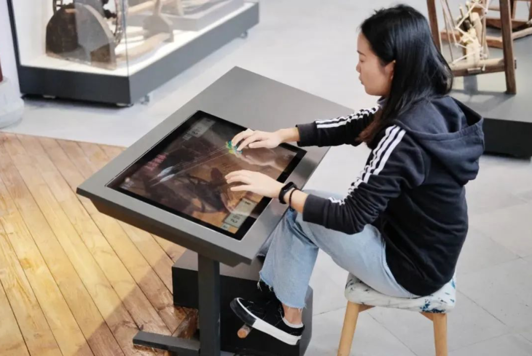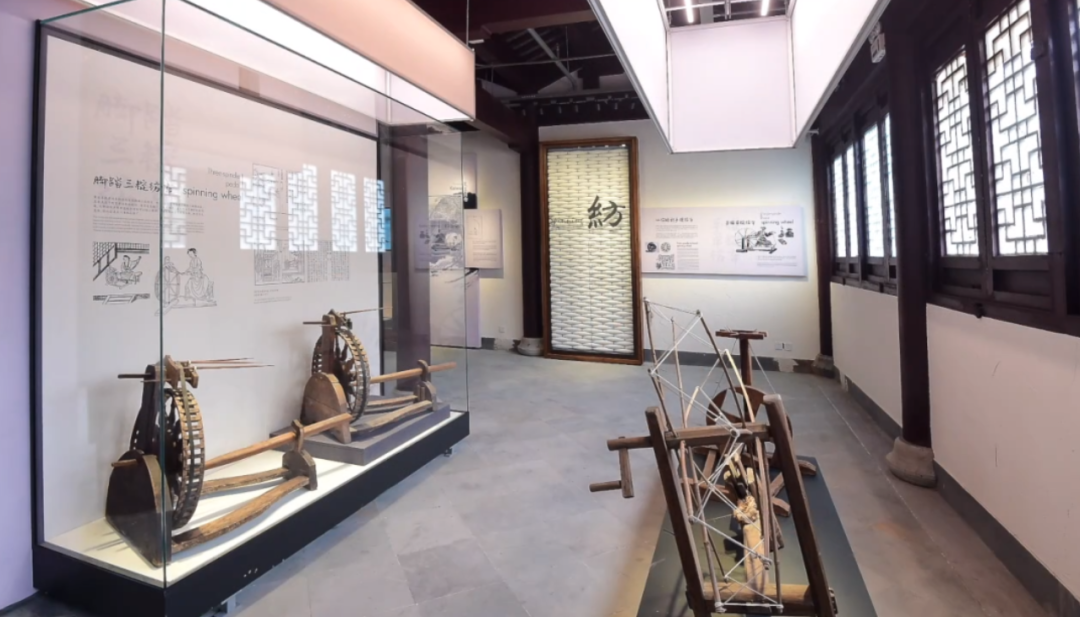 馆内实物展示众多,互动体验也不少。游客不仅可以亲眼看到黄道婆发明的三锭纺车,还可以在多媒体屏幕上现场体验“纺线”。脚踏板模拟纺车转动,屏幕提示拉动纺线,考验手脚配合能力,同时拉动三根纺线固定,线不断就代表纺纱成功。