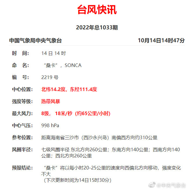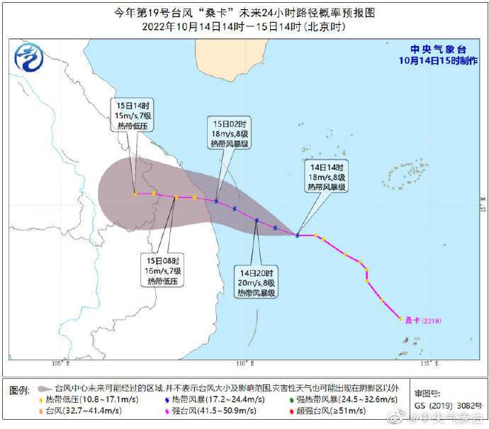 10月14日14时,今年第19号台风“桑卡”(热带风暴级)(英文名称:Sonca;名字来源:越南;名字意义:一种会唱歌的鸟)生成。预计15日凌晨到上午,其将在越南中部沿海登陆,登陆后逐渐减弱。 ​​​​