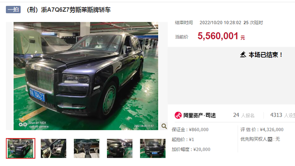 10月19日至20日,浙江庆元县法院公开拍卖了四辆涉刑汽车,起拍价均为1元。其中包括被称为全球最贵的SUV劳斯莱斯“库里南”一辆,另有奔驰G500、路虎卫士各一辆,及一辆江铃全顺。