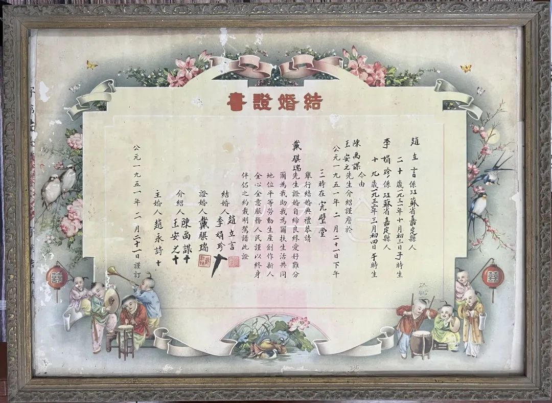 结婚证书详实记录了新人的姓名、籍贯、出生时间,以及介绍人、证婚人、主婚人的姓名。领取结婚证书的典礼于1951年2月21日下午3点在完壁堂举行。证书上还有一段祝福,大意是希望新人在今后的生活中互帮互助、共同劳动生产、全心全意服务人民。证书的四周还印有敲锣打鼓的孩童、鸳鸯、喜鹊、蝴蝶、牡丹、荷花等寓意美好的图案,极为喜庆,富有年代感。