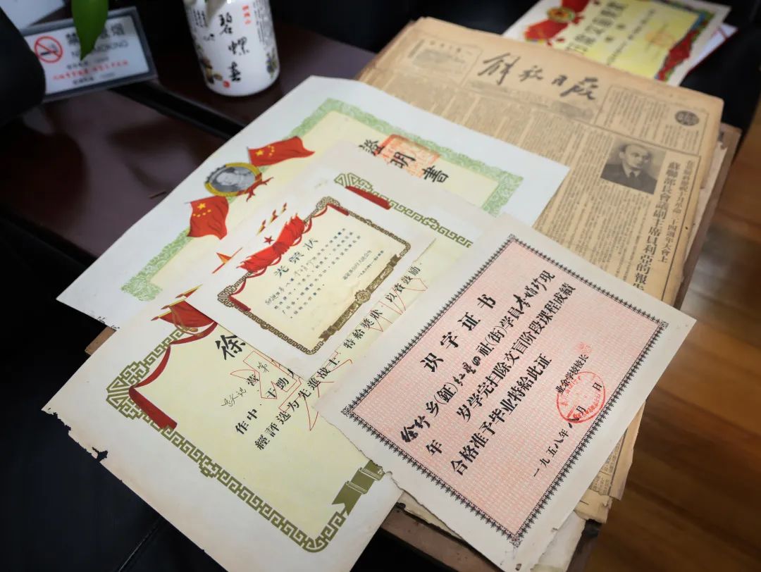 在捐赠过程中,还发生一段趣事。当区档案馆工作人员把结婚证书从镜框中移出时,发现镜框中还夹着父亲的初中学历证书和母亲的光荣状、识字证书等4张证书奖状,且都保存完好。