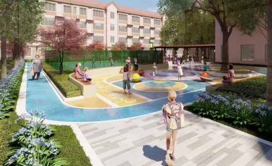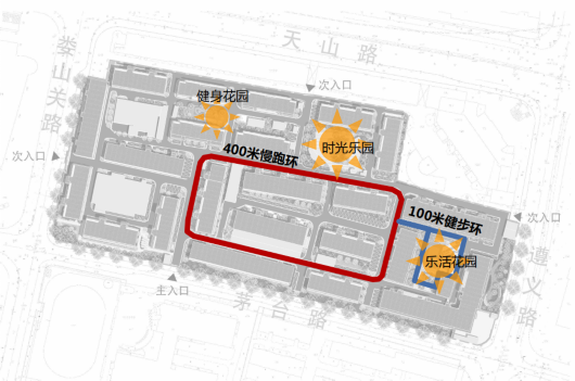 结合天山二村居民区的实际情况和场地特色,此次精品小区建设将呈现健身花园、时光乐园、乐活花园和100米健步环、400米慢跑环五大特色场景,形成“两环三园”的特色景观。其中,“两环”的设计考虑到居民区内老年人口较多的特点,让老年人出门即是专业步道,既满足日常运动需求,也能进一步确保安全,此外也为社区青年运动慢跑提供了便利;“三园”则是保留新打造的时光乐园,将此处营造为安静惬意的老年人休憩场所,同时打造乐活花园,最大程度保留现状设施,对铺装及坐凳进行更新改造,吸引社区居民休闲活动;另外,利用绿化空间打造康养和健身花园,增添休憩功能和宠物活动功能,满足西片区居民休闲活动需求的同时,提高社区花园的服务覆盖率。