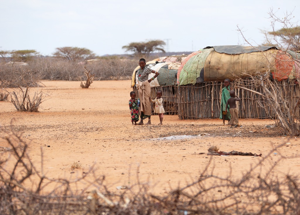 8月26日,人们站在肯尼亚马萨比特郡莱萨米斯镇一干旱的村庄内。新华社记者董江辉摄