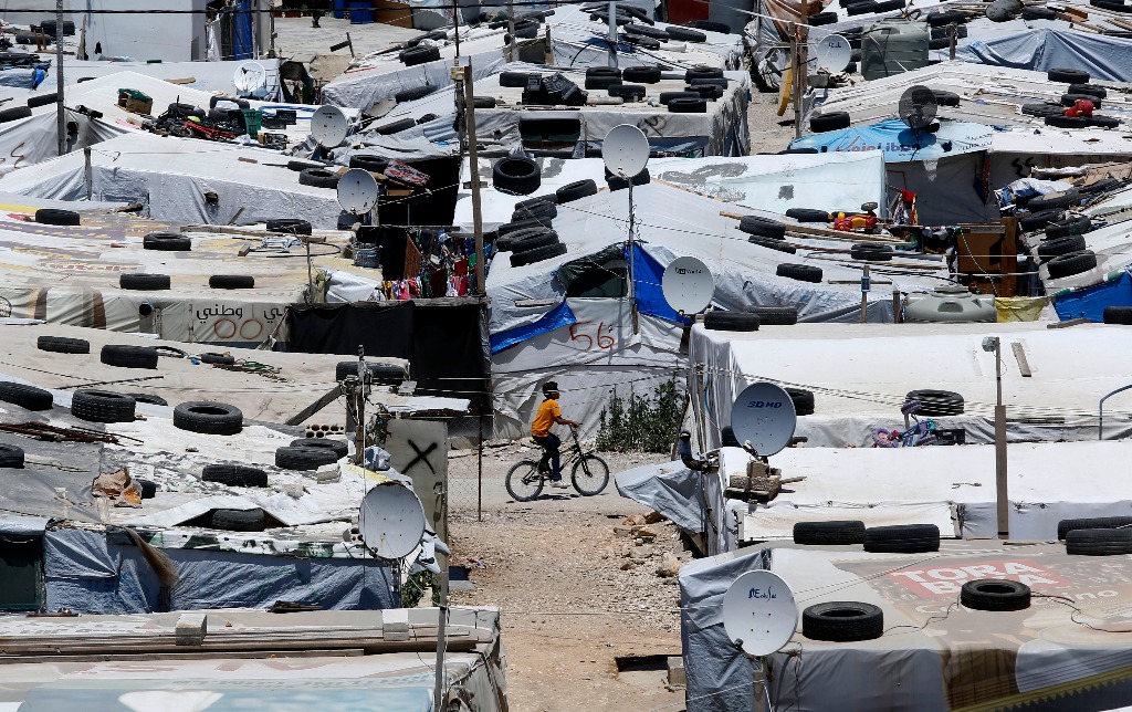 2018年6月19日,在黎巴嫩东部贝卡谷地巴尔伊勒亚斯地区,一名难民儿童在叙利亚难民营内骑车。新华社发(比拉尔·贾维希摄)