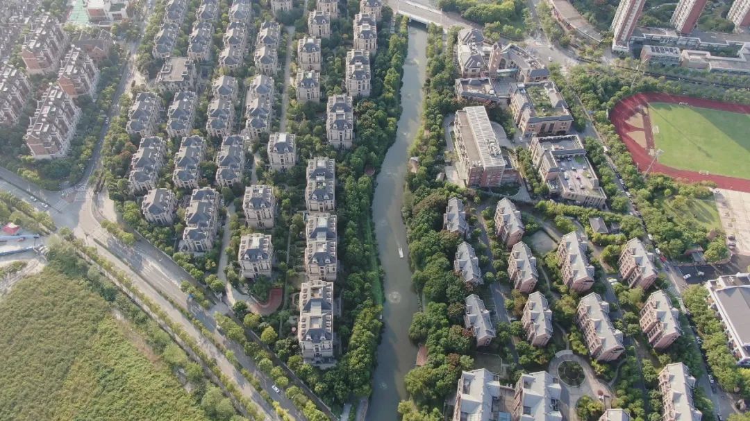 在新江湾城凭空鸟瞰,你会看到一条蜿蜒曲折的河道,它的名字叫纬五河,是新江湾城生态型景观河道。