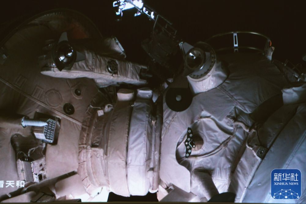 11月1日在北京航天飞行控制中心拍摄的空间站梦天实验舱与空间站组合体在轨完成交会对接。这是梦天实验舱对接锁锁紧完成。新华社发(孙丰晓摄)