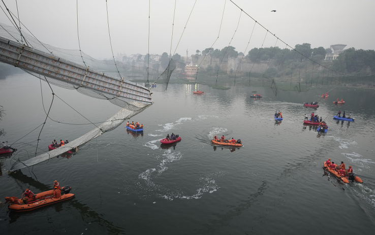 30日晚上,大约500人买票上桥庆祝排灯节,然而该桥只能承载大约125人的重量。一段视频显示,此前曾有很多人在桥上蹦跳和奔跑,吊桥也因此而出现晃动。