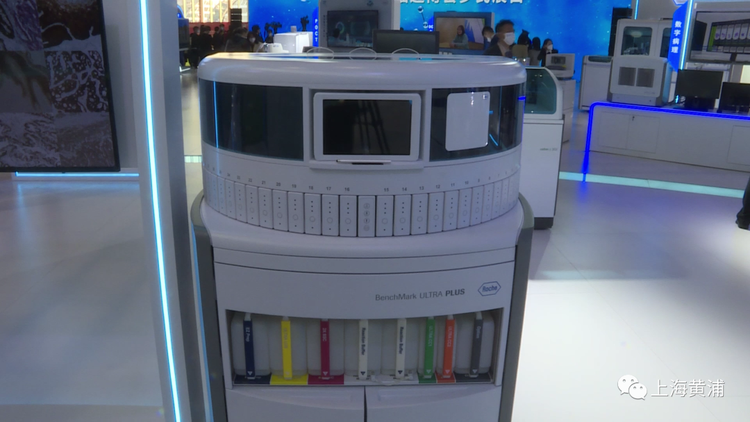 瑞士罗氏是连续五届参展的老朋友,属下的罗氏诊断今年携带了不少创新产品亮相。BenchMark ULTRA PLUS的中文名叫全自动免疫组化及原位杂交染色平台,大小就像上海人家的五斗橱,但却功能强大,主要用于对组织切片进行染色,染色后不同的细胞组织、不同蛋白的着色深浅不一样。