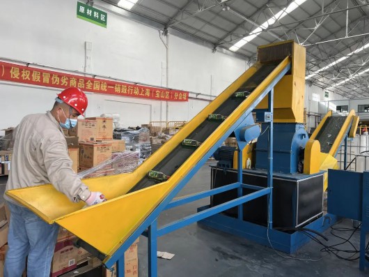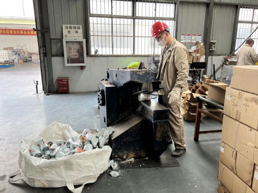 根据不同侵权假冒商品的特性,工作人员采取拆解、破碎、碾压等分类处置方式进行无害化处理,有效防止侵权假冒伪劣商品“二次流通”“二次污染”。