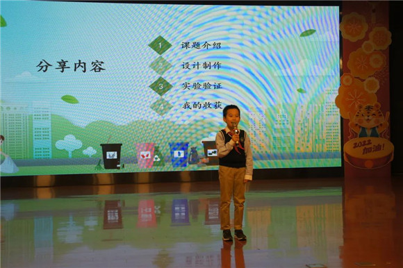 学校的创智导学课程中有一门有趣的科技类课程,那就是科学种子学堂,那里可是同学们的课题孵化基地。每年有很多有意思的课题从那里诞生,从课程中走出的学生参加了市区科创比赛,获得优异成绩。在开幕式上四(2)班张沐云介绍了他的创新作品,他获得上海市创新大赛一等奖。