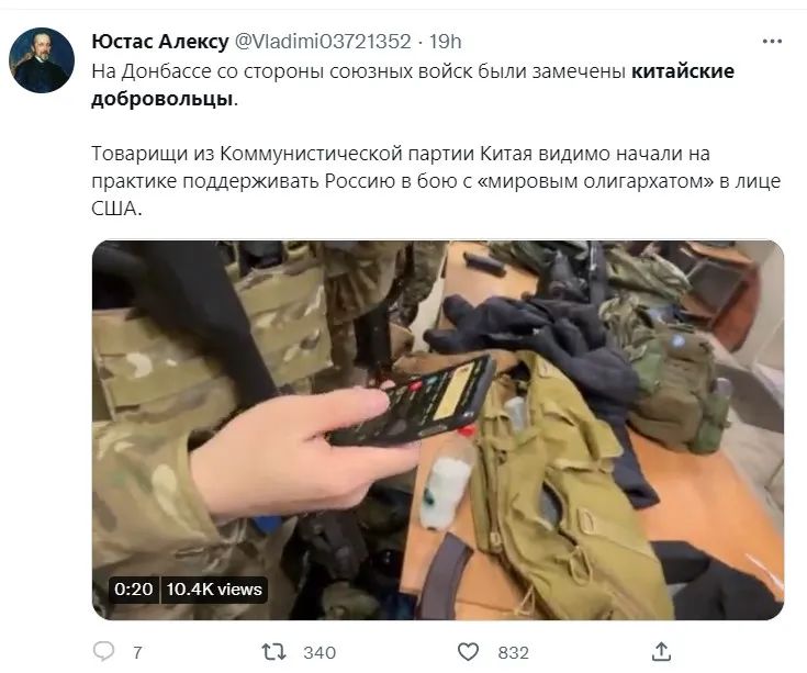 进一步用俄语检索可以发现另一段出镜人物相同的视频。定位于俄罗斯的推特用户配文称,“盟军在顿巴斯发现了中国志愿者。”新视频中,右侧男子用中文与同伴交流表示“我不知道这个怎么说”,随后向视频拍摄者展示了一段抖音视频。