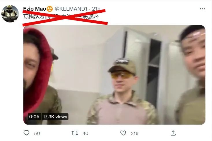 近日,推特上流传一则视频据称是“瓦格纳发的部队中的中国志愿者”。视频中除了使用俄语的拍摄者,还有三名亚洲人向镜头打招呼,其中一人戴着有中国国旗的臂章。