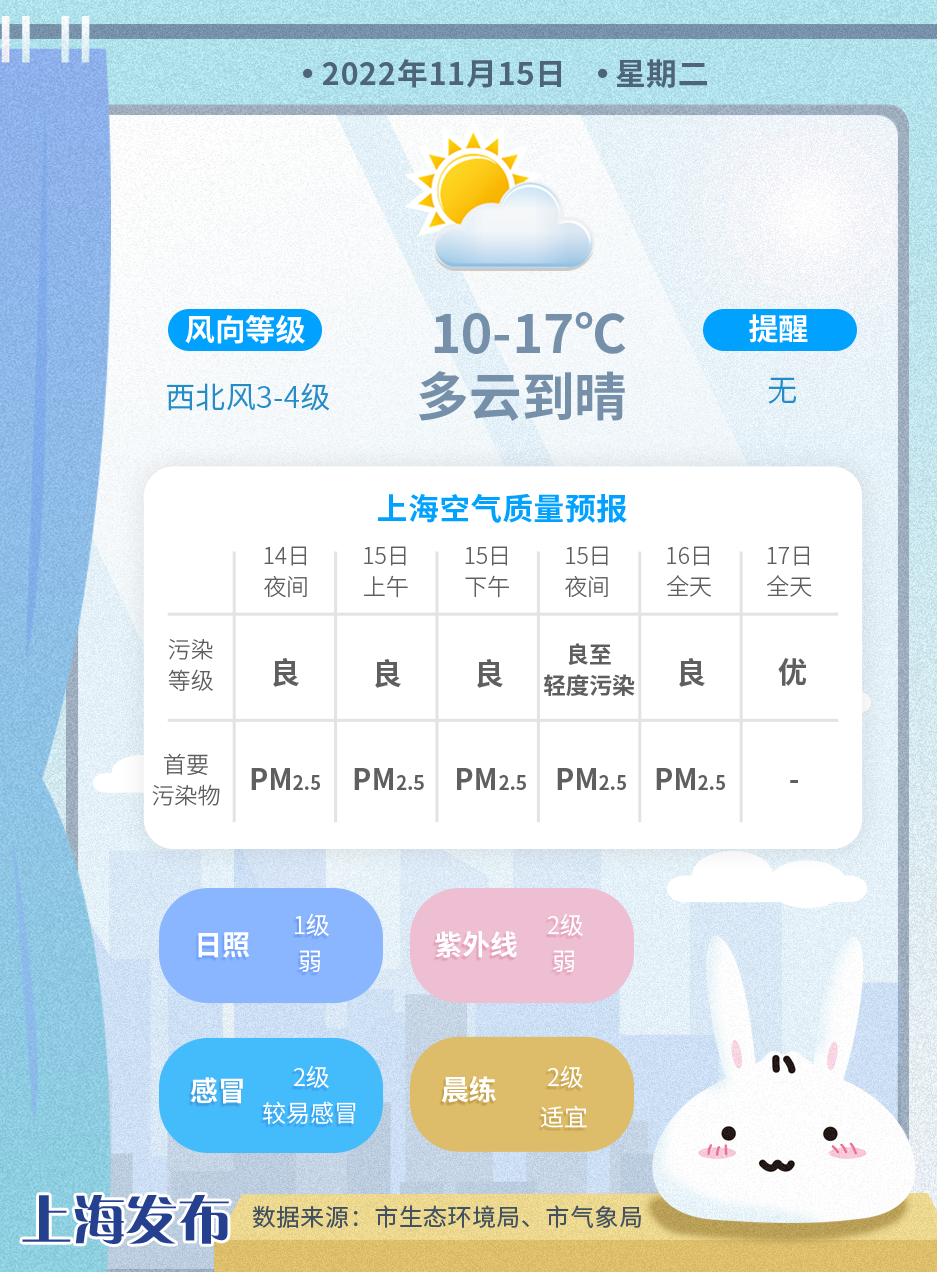 11月15日将迎来本周唯一的晴好天气,多云到晴,气温10~17度,北到西北风3~4级,空气相对湿度90%~50%。早晚气温仍然较低,郊区多在10度以内,白天阳光出现升温迅速,大家抓紧洗晒。图片