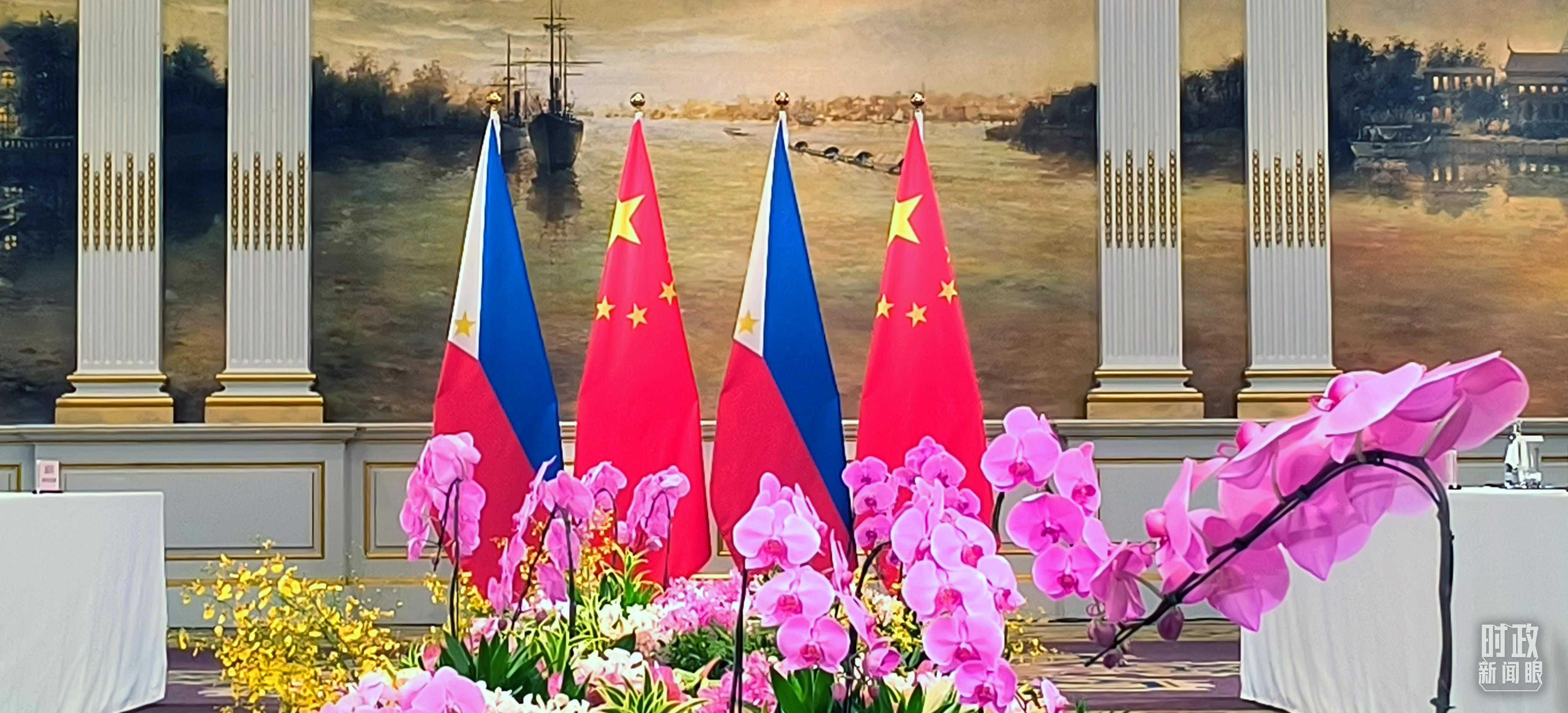 △会谈现场的中菲两国国旗。(总台央视记者范凯拍摄)