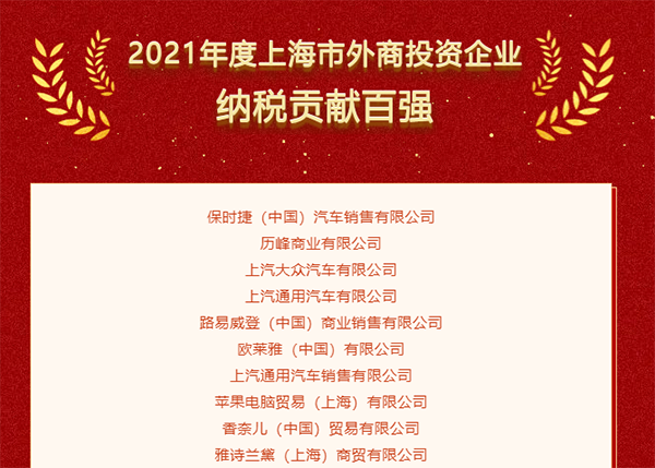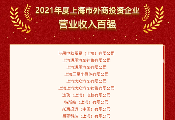 2021年度,共计253家外商投资企业入围上海市外商投资企业营业收入、进出口总额、纳税贡献、创造就业四项百强榜单。位列各榜单首位的分别是苹果电脑贸易(上海)有限公司、达功(上海)电脑有限公司、保时捷(中国)汽车销售有限公司和昌硕科技(上海)有限公司。