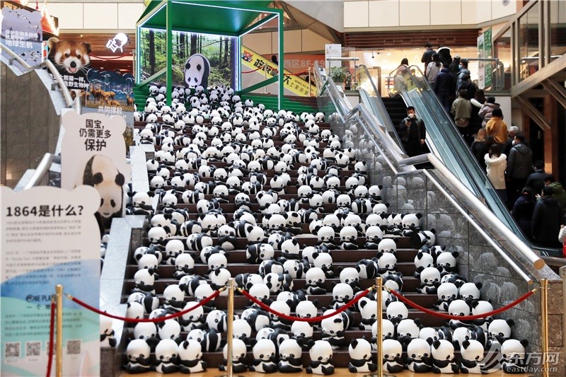 如今,“1864大熊猫巡展”来到上海,500余只纸雕塑大熊猫宝宝铺满正大广场罗马台阶,憨态可掬,场面十分壮观可爱,吸引来往市民游客驻足欣赏,拍照留念。现场还同步设置了自然科普展区和趣味互动打卡内容,观众可以在展区阅读动物保护的科普知识。