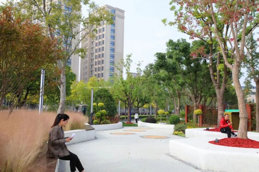 德园口袋公园的改建在充分考虑周围环境,听取市民意见后,以“巢栖林语”为主题进行提升改造,打造亲近自然、返璞归真的生态林间,选用本地乡土植物乌桕、朴树等,实现一步一景,四季皆景的花园景色。一条生态透水的漫步道穿梭在林间,沿着透水道的两侧还设置了休憩的座椅,满足了市民游园需求。