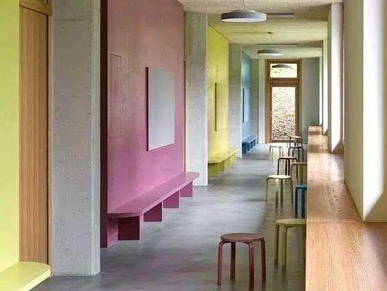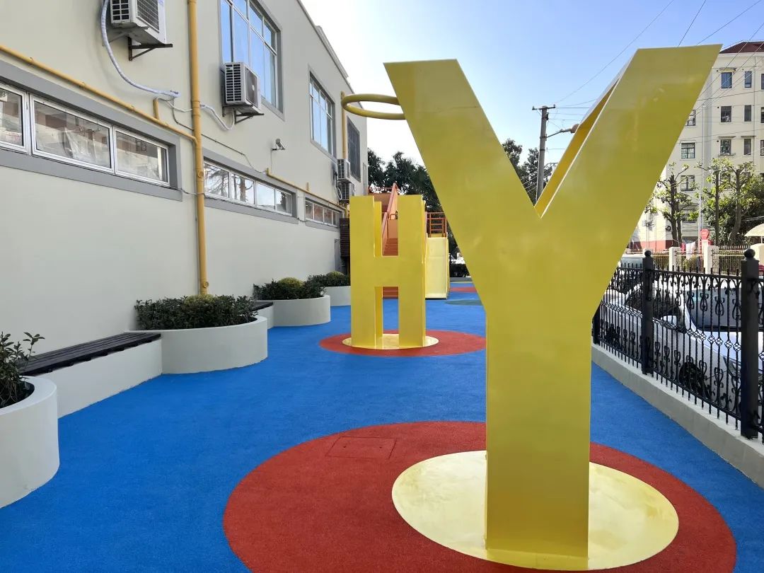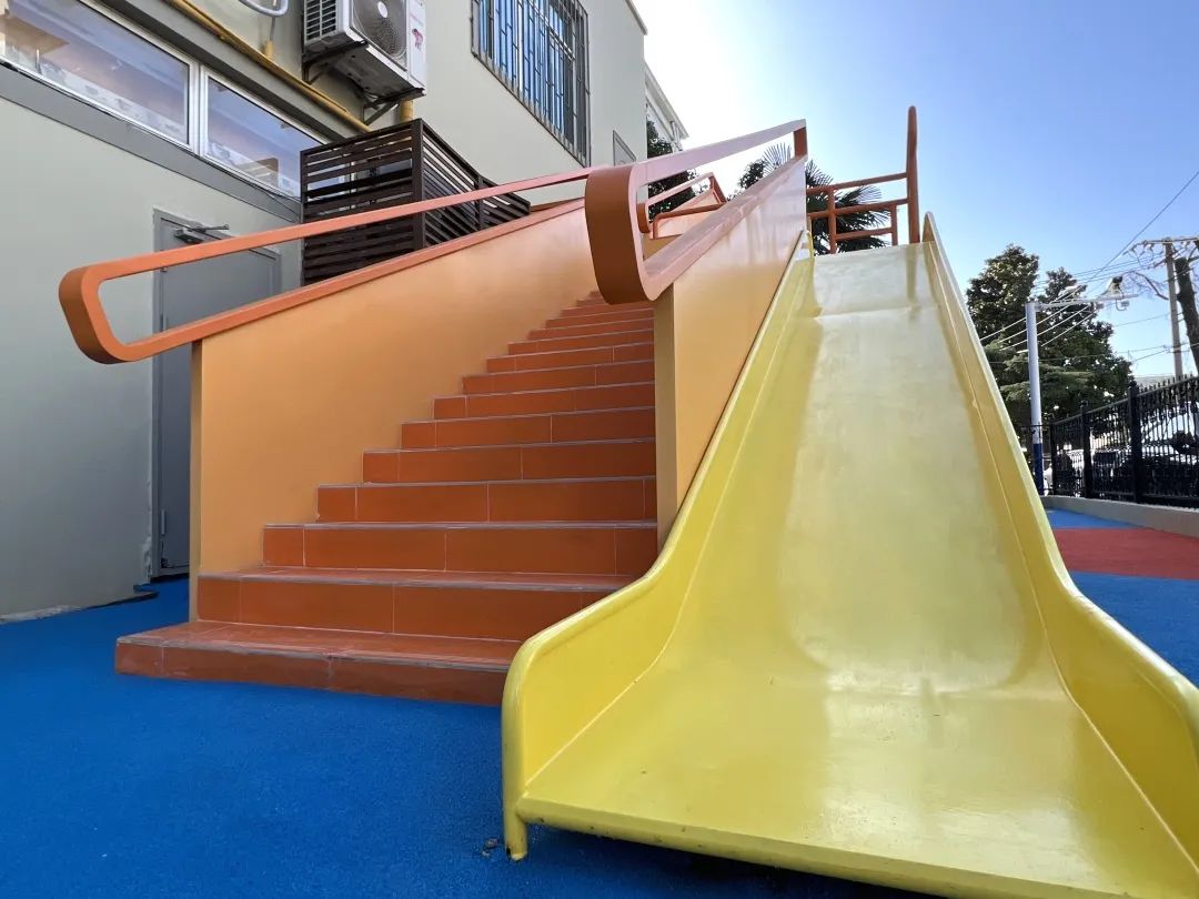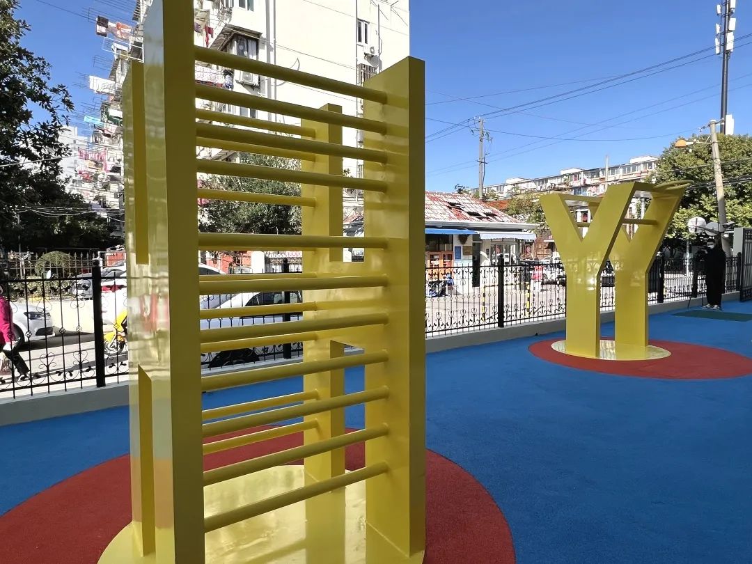 改造后,重新铺设的塑胶地面由红、黄、蓝、绿四种色彩组成,鲜活明亮,一定程度上可保护孩子在奔跑时免受伤害。Y、H两个字母型的地标性LOGO装置立在正中,象征着“殷行”二字,加深与社区的融合感。最深处的手扶楼梯通往二楼室内,呈橘黄色,旁边附有黄色滑梯,供孩子们游玩。