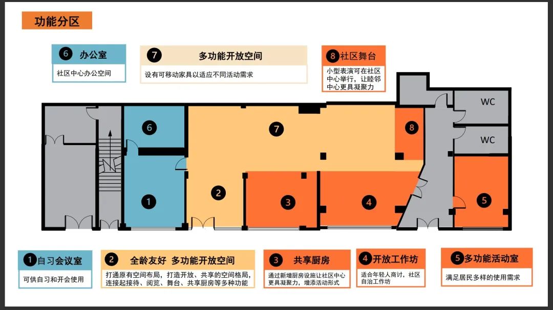 为此,在二次设计时,负责人着重强调了功能规划,分隔出自习会议室、多功能开放空间、共享厨房、开放工作坊、社区舞台等不同空间,为不同年龄段的居民提供独特享受。尤其在多功能开放空间中,书柜、座椅、沙发等家具摆放灵活,随时可改变整体布局,以适应多变的活动需求,让未来有更多可能性。