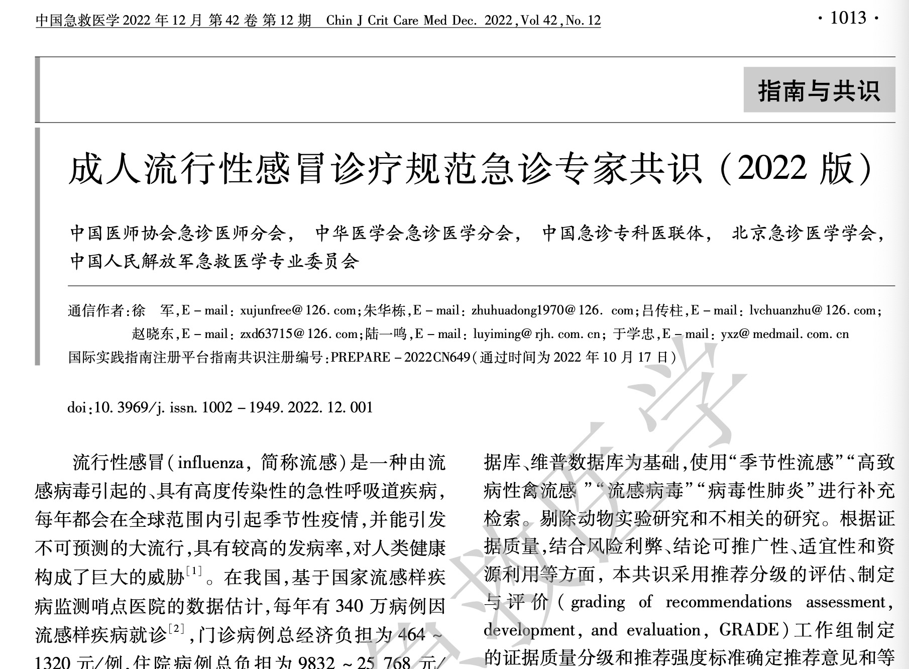 《成人流行性感冒诊疗规范急诊专家共识(2022版)》近期已发布在《中国急救医学》杂志上。 杂志截图