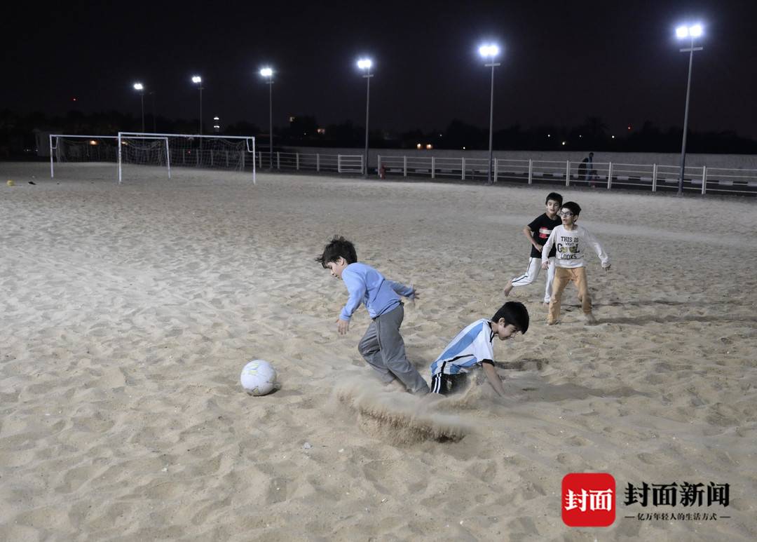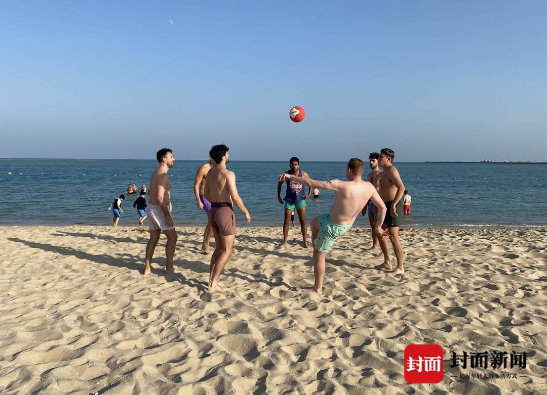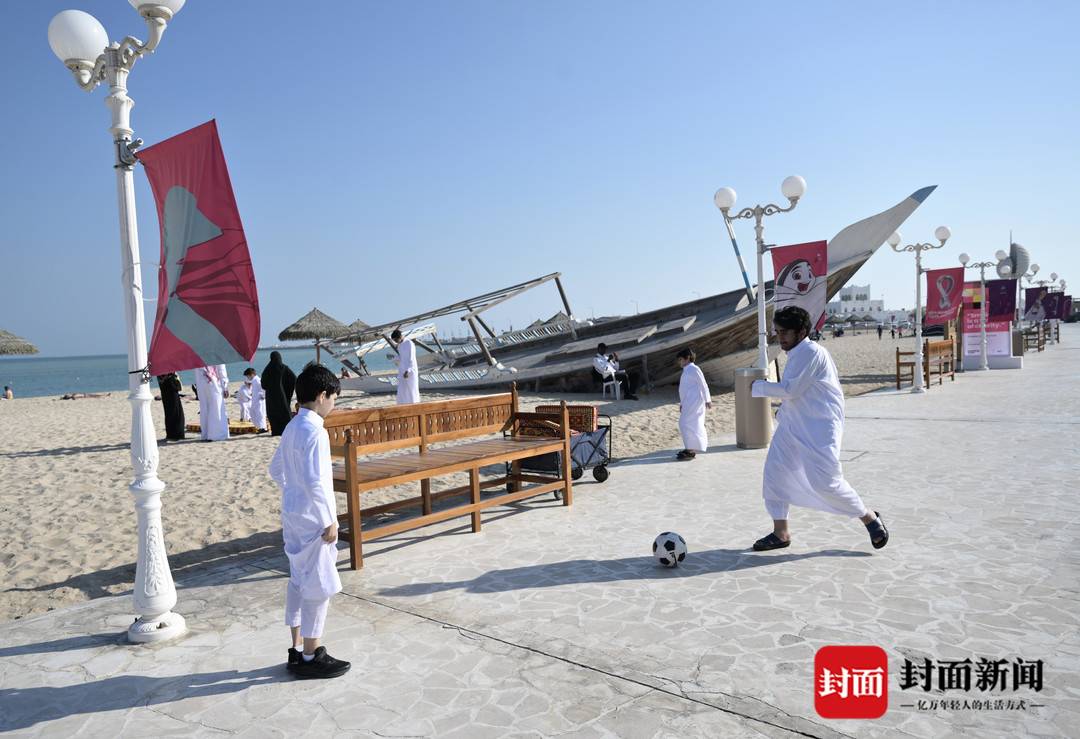 卡塔尔三面环海,毗邻波斯湾,位于海洋和沙漠的交汇点,亚热带沙漠气候让这里全年都阳光充足,拥有温暖的冬季。12月16日,卡塔尔世界杯决赛前的休赛日,不少球迷们来到多哈附近的海滩享受日光浴,还有球迷带上足球,在这里玩起沙滩足球,与来自世界各地的球迷们切磋球技。而沙滩足球也深受卡塔尔本地小朋友的喜爱,经常可以见到小朋友在沙滩上组队比赛,或者是父亲带着孩子踢球玩耍。在多哈街头,也经常可以碰到小朋友拿着足球玩耍。而当地年轻人则是喜欢相约到人工草坪的五人制球场,享受对抗更为激烈的足球比赛,其中不少人喜欢光脚踢球,但比赛的竞技性一点不打折,近距离爆射、倒地飞铲,样样不缺。许多来到卡塔尔看球的中国球迷也相互约坝坝球,与当地足球爱好者组队混战,享受足球快乐的同时,结交志同道合的朋友,交流看球体会。