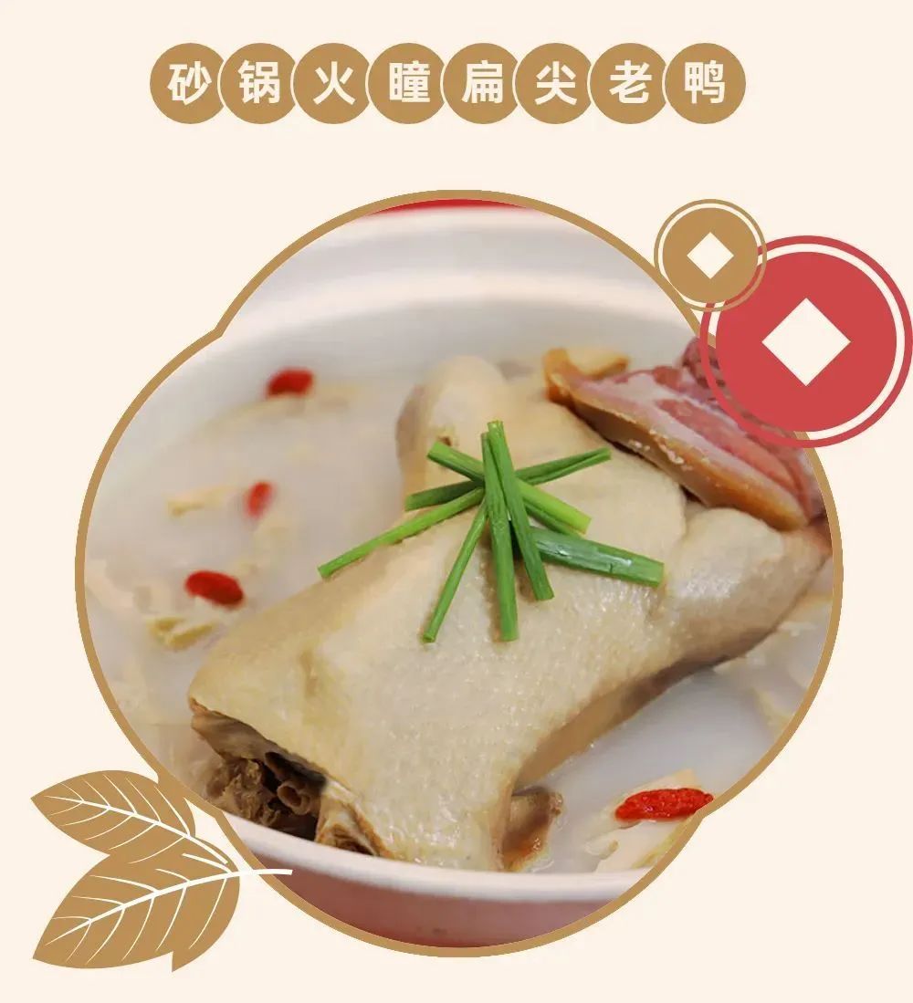 砂锅火瞳扁尖老鸭经过文火慢炖,鸭脂黄亮、鸭肉鲜嫩酥烂,加入煲汤中增味提鲜的宝藏食材—火腿筒骨,在砂锅中炖煮至汤白浓郁,搭配肉质厚嫩的扁尖,鲜美可口。