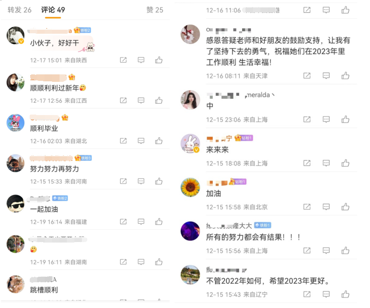 还有网友感恩一路帮助过自己的同路人,并表达祝愿,“感恩老师和朋友的鼓励支持,让我有了坚持下去的勇气,祝福他们在2023年里工作顺利,生活幸福!”