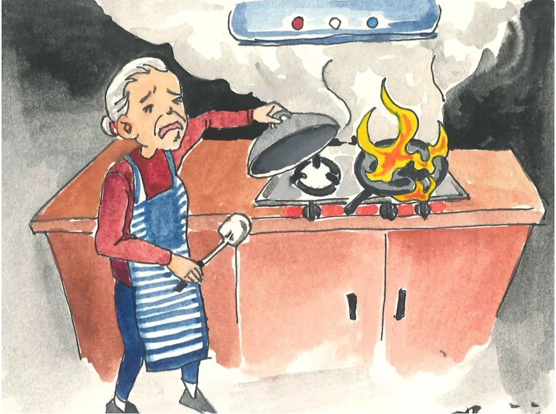 用火不离人,离人不用火。要定期为老人检查管道,清理灶台和烟道油污。油锅起火时,千万不要用水灭火,可以用锅盖把油锅盖上或倒入青菜,达到灭火效果。有条件的也可在家中配置灭火器。