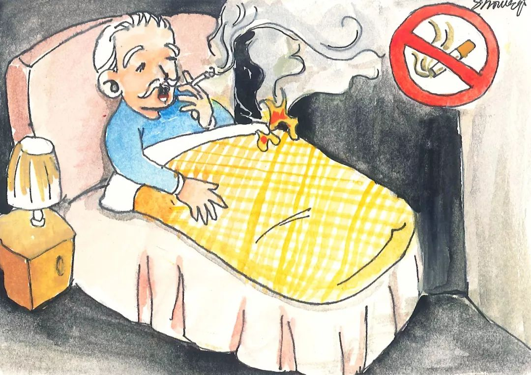 抽烟的老人一定不要躺在床上或沙发上吸烟,特别是行动不便、不能自理的老人,吸烟时要有专人照看,做到烟火分离,同时要配备独立式烟感探测器。