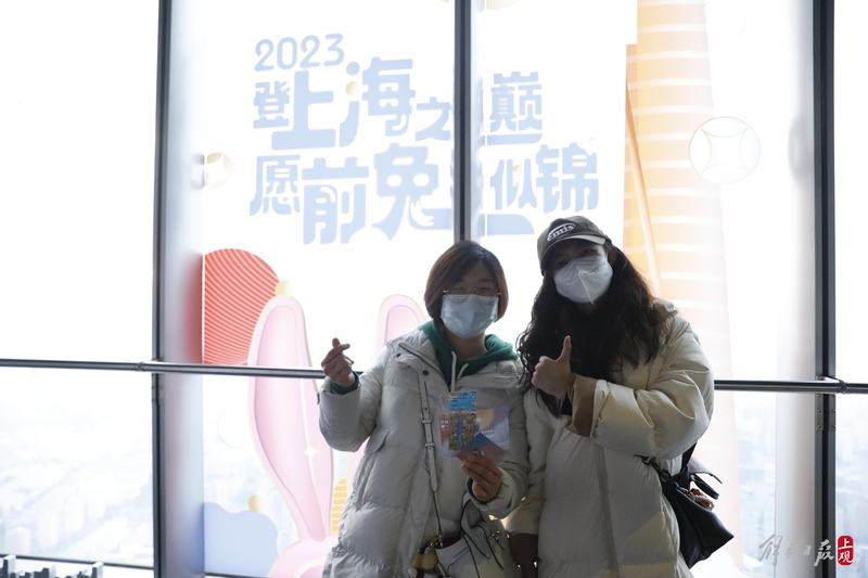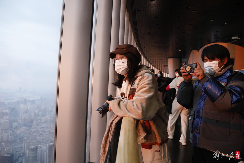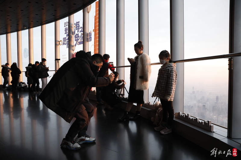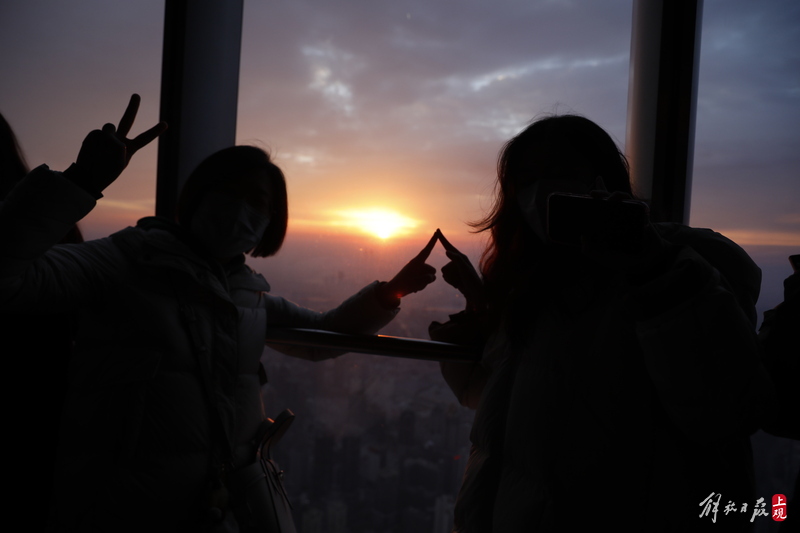 市民来到上海中心118-119层的“上海之巅”观光层,观赏新年日出,许下美好愿望。