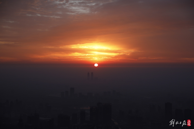 2023年上海第一缕曙光。6点15分许,天空渐亮。随着旭日发出的第一缕曙光,撕破黎明前的黑暗,东方天幕由漆黑,逐渐转金红色。6点50分,橘红色的太阳全部露出云层,全新一天开始了。