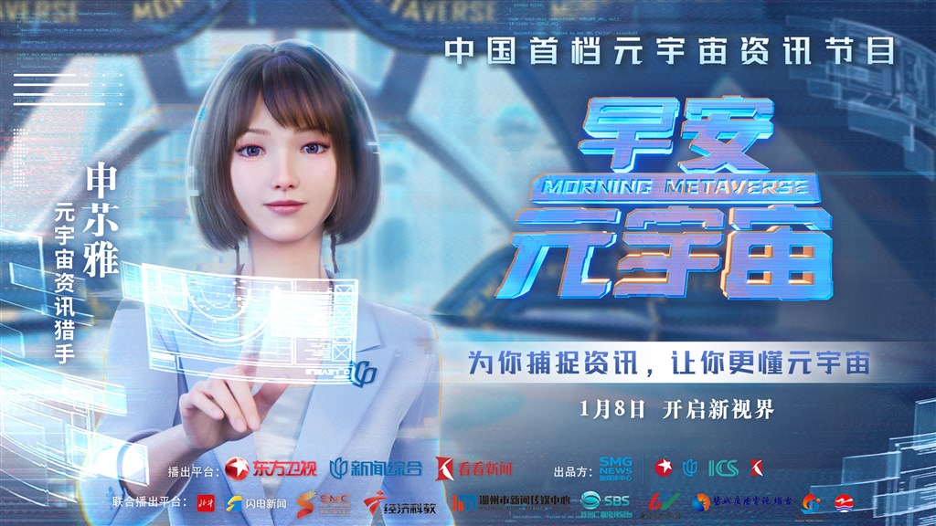 1月8日起,国内首档元宇宙资讯节目《早安元宇宙》开播。这档节目由SMG的虚拟新闻主播申䒕雅主持,她将担任“元宇宙资讯猎手”,用通俗易懂的方式为观众播报和解读元宇宙的最新消息。