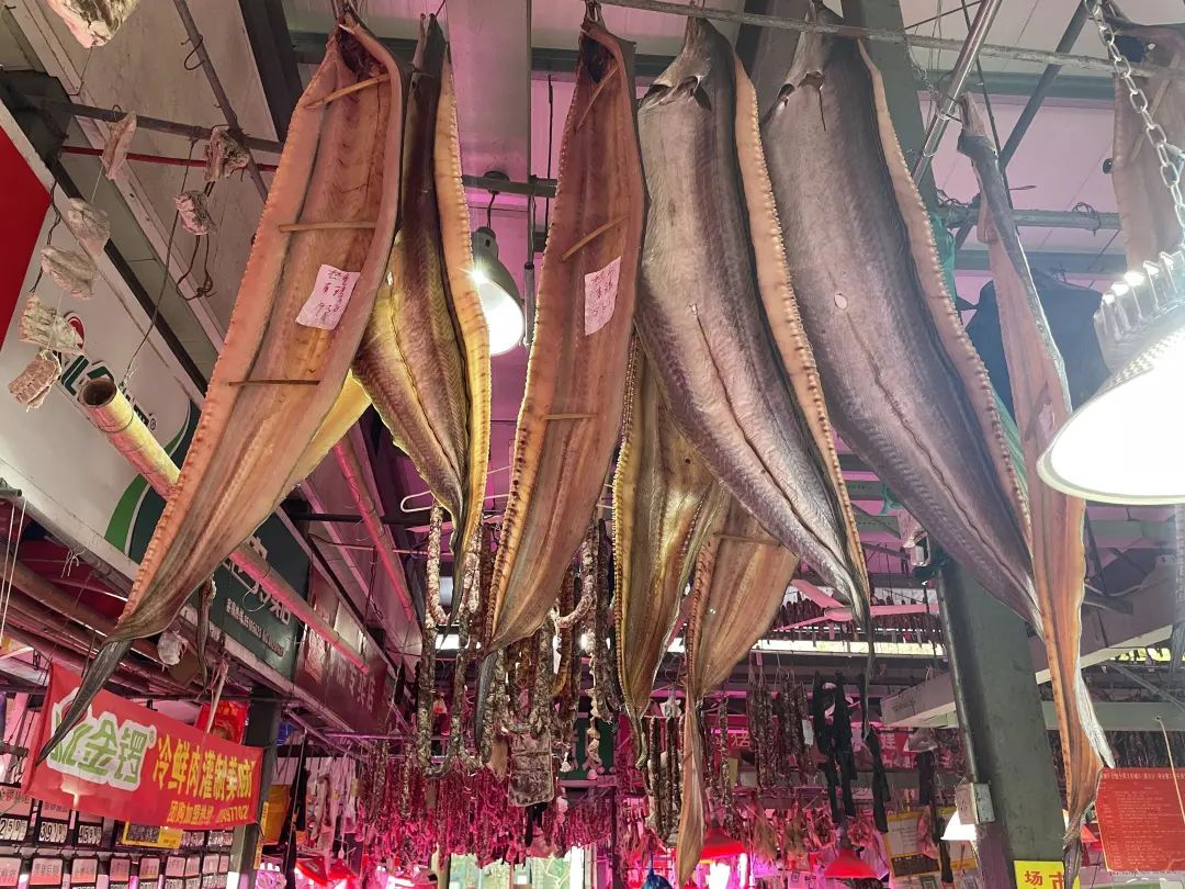 如果说入口处是“腊味森林”,那菜场里基本就是“鱼鲞天下”,一排排高挂的鳗鲞更是壮观。