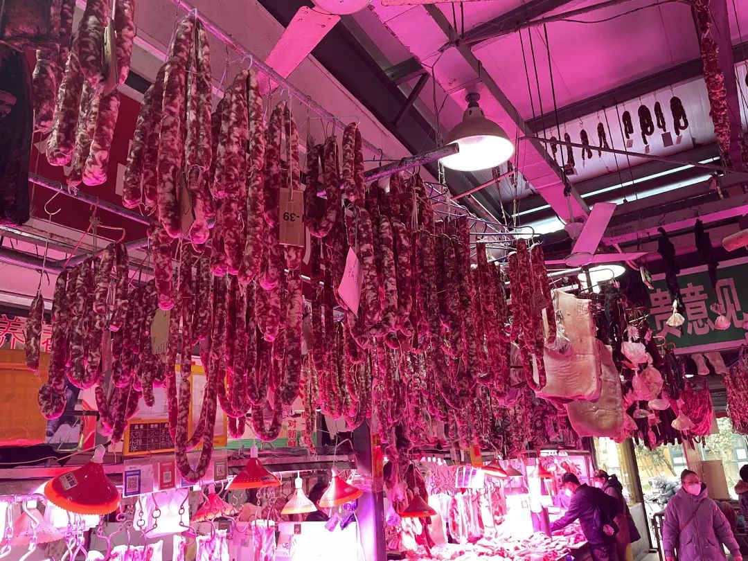 走进菜场,先要通过一片“腊味森林”。抬头望去,腊肠、酱油肉、腊鸭等过年必备菜肴,应有尽有。