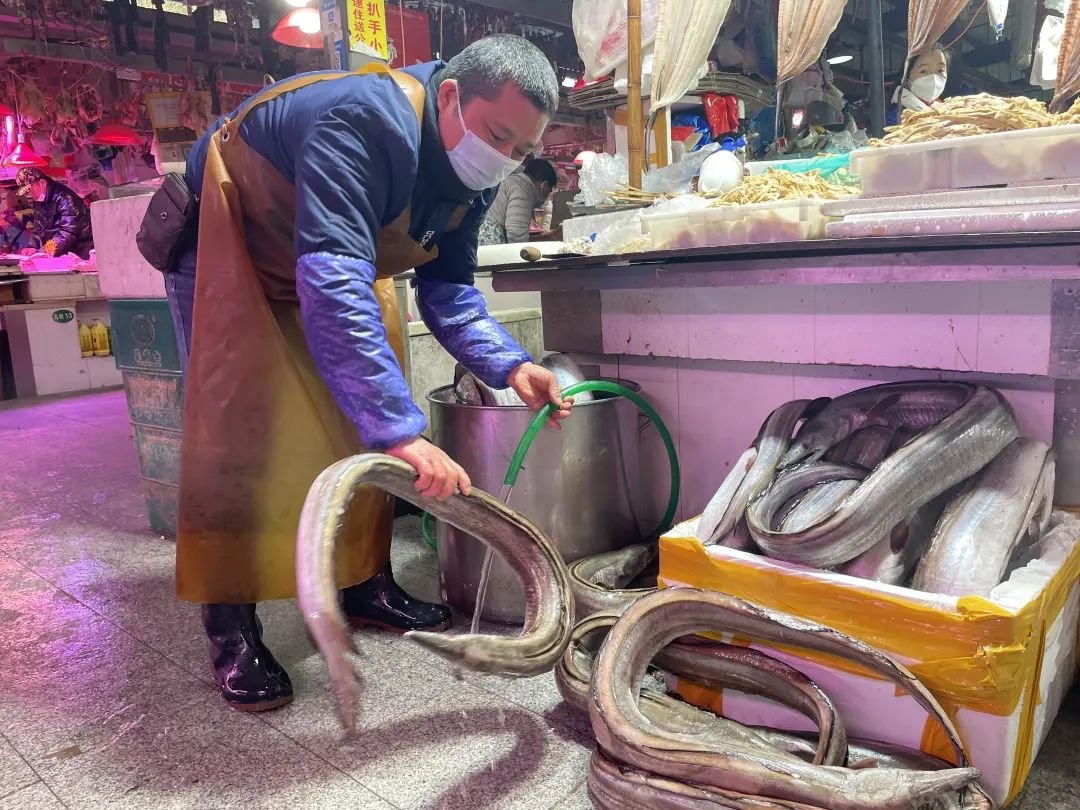 她口中的“很香”的鳗鲞,正是出自浙江温岭的李老板经营的摊位,他经营水产生意已将近30年。这会儿,他正在清理当天刚到货的鳗鲞。“往年冬至一过,生意就开始起来了,许多老主顾们从四面八方来到我这里选购。今年太不巧了,那段时间很多人都‘中招’了,我原本以为今年‘惨’了。幸好元旦之后陆陆续续恢复起来,而且今年大家基本都选择热气鳗,价格高但吃口更好,所以营收和往年基本持平。”