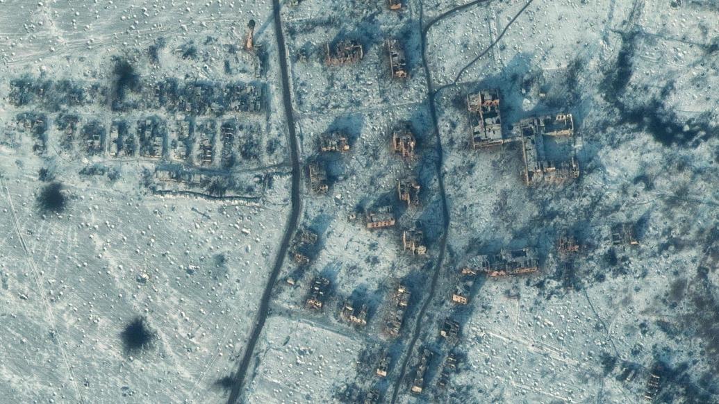 当地时间2023年1月10日,顿涅茨克地区巴赫穆特,卫星图像显示索列达尔南部被摧毁的学校和建筑。视觉中国 图